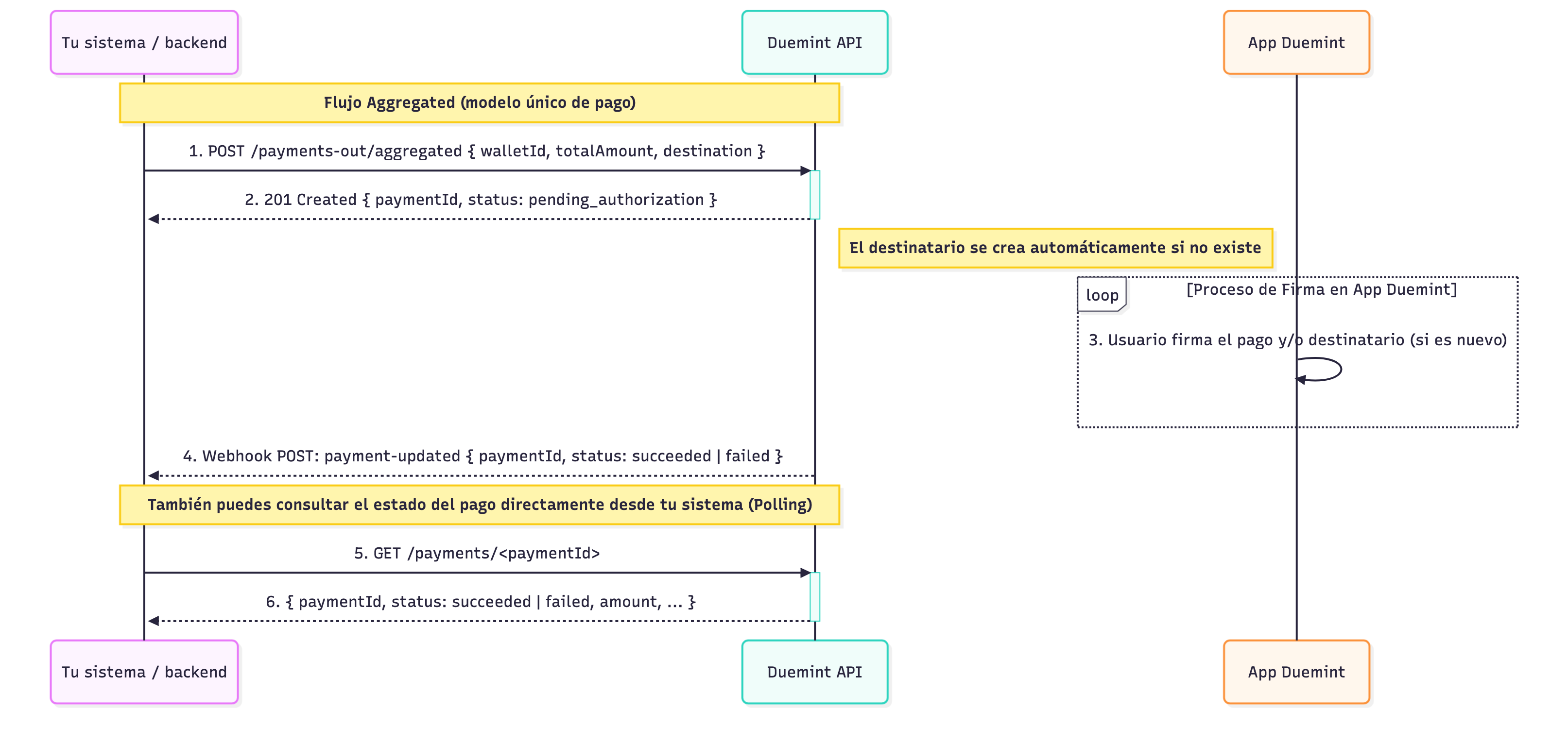 El flujo técnico se basa en un modelo único llamado Aggregated, que simplifica la operación combinando en una sola solicitud la creación del pago y del destinatario.