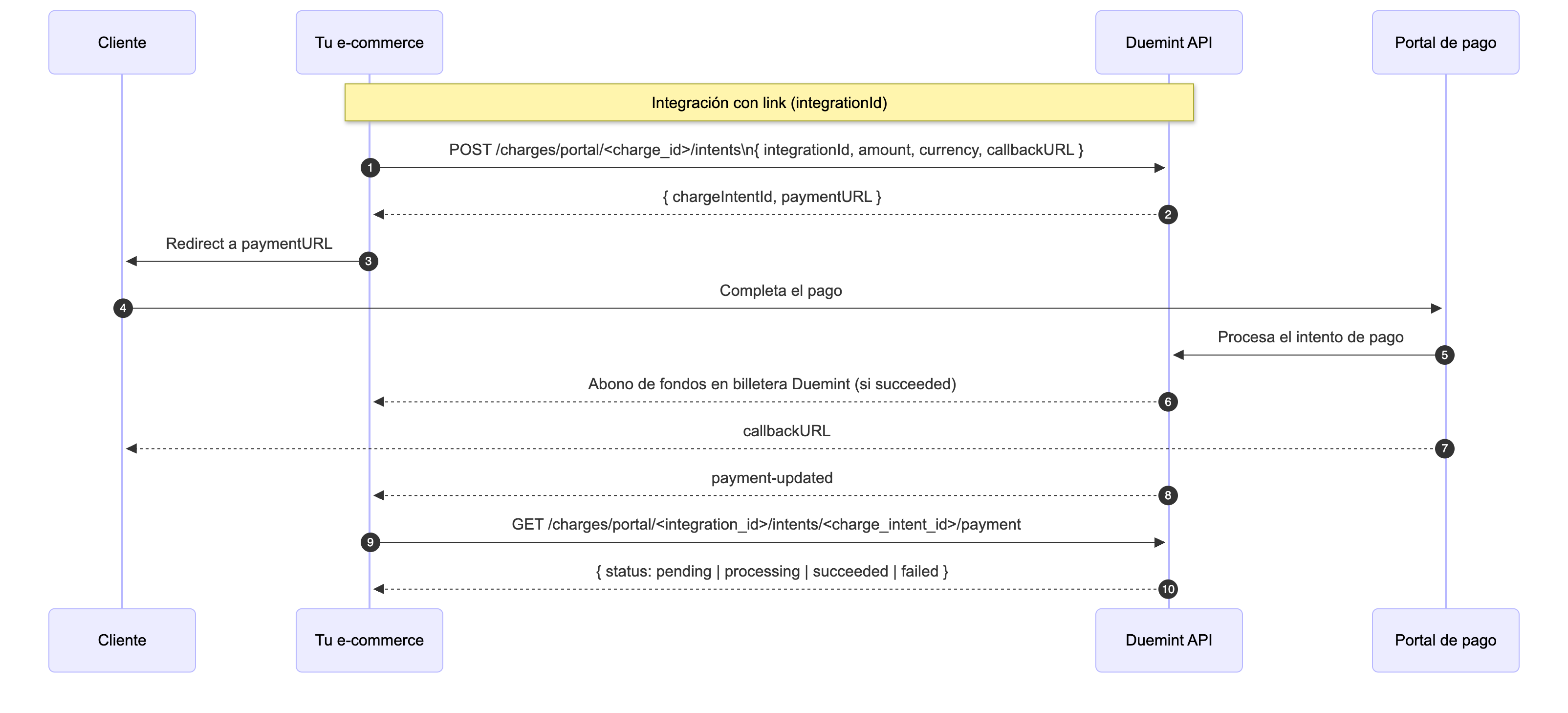 chargeIntentIdy unpaymentURL. - El sistema de Duemint procesa el pago internamente.